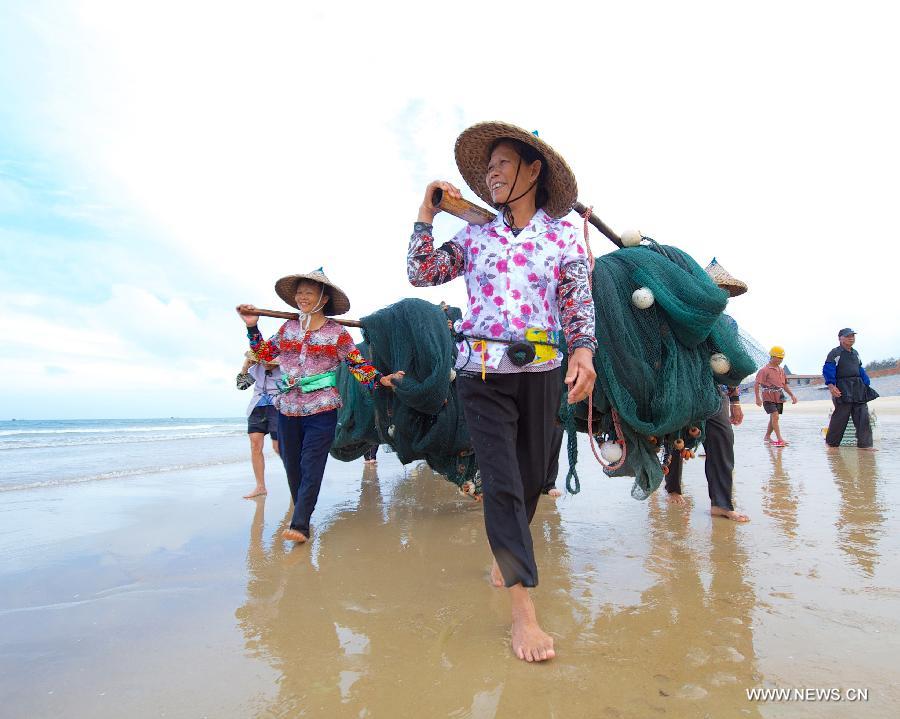 Local fishers prepare to pull nets on Jinluanwan beach of Dongshan Island, southeast China's Fujian Province, June 20, 2014. Dongshan Island, the second largest island in Fujian, is located in the southeast of Fujian and with Taiwan across the sea to the east. (Xinhua/Jiang Kehong)