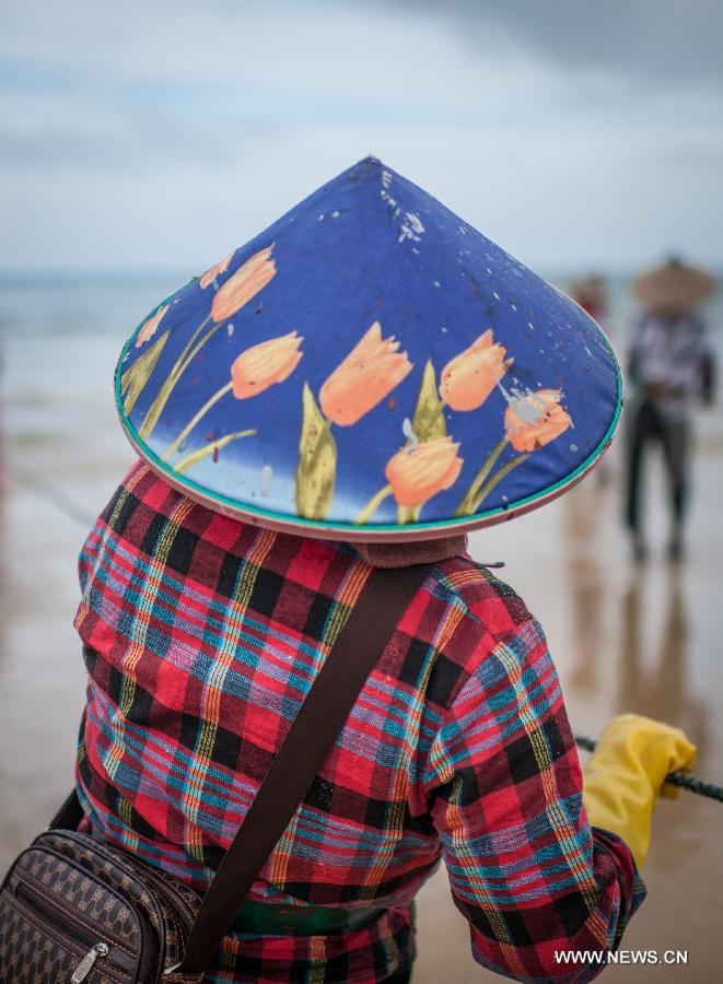 A local fisher pulls a net on Jinluanwan beach of Dongshan Island, southeast China's Fujian Province, June 20, 2014. Dongshan Island, the second largest island in Fujian, is located in the southeast of Fujian and with Taiwan across the sea to the east. (Xinhua/Shen Hong)