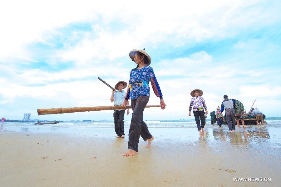 Local fishers prepare to pull nets on Jinluanwan beach of Dongshan Island, southeast China's Fujian Province, June 20, 2014. Dongshan Island, the second largest island in Fujian, is located in the southeast of Fujian and with Taiwan across the sea to the east. (Xinhua/Jiang Kehong)