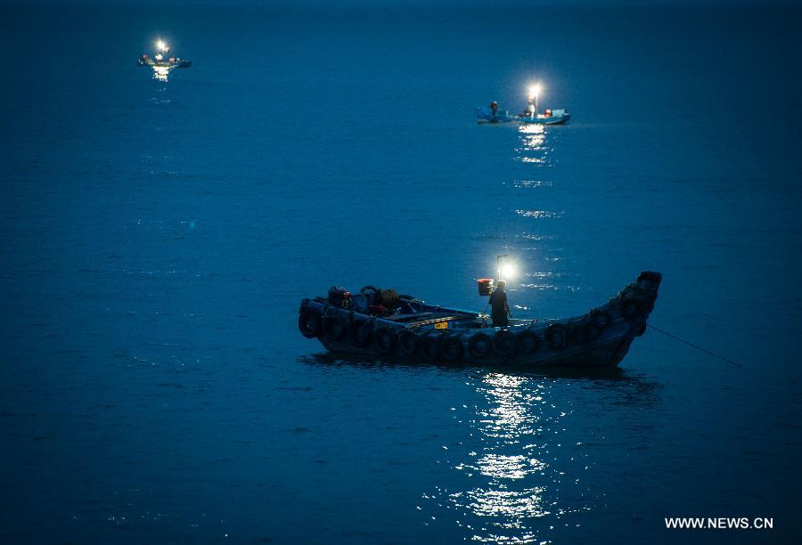 Photo taken on June 20, 2014 shows local fishing boats on the Nanmenwan sea area of Dongshan Island, southeast China's Fujian Province. Dongshan Island, the second largest island in Fujian, is located in the southeast of Fujian and with Taiwan across the sea to the east. (Xinhua/Shen Hong)