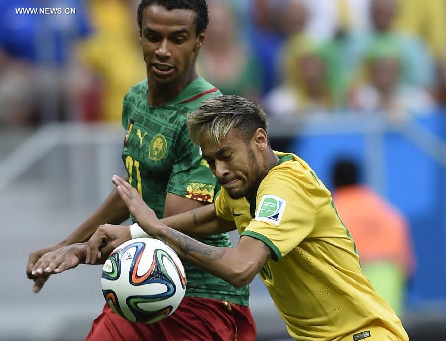 Brazil's Neymar (front) competes during a Group A match between Cameroon and Brazil of 2014 FIFA World Cup at the Estadio Nacional Stadium in Brasilia, Brazil, June 23, 2014. Brazil won 4-1 over Cameroon on Monday. (Xinhua/Qi Heng)