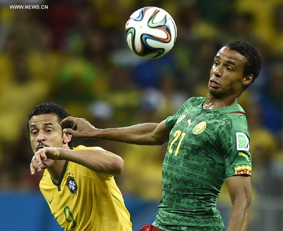 Brazil's Fred (L) vies with Cameroon's Joel Matip during a Group A match between Cameroon and Brazil of 2014 FIFA World Cup at the Estadio Nacional Stadium in Brasilia, Brazil, June 23, 2014. (Xinhua/Qi Heng)
