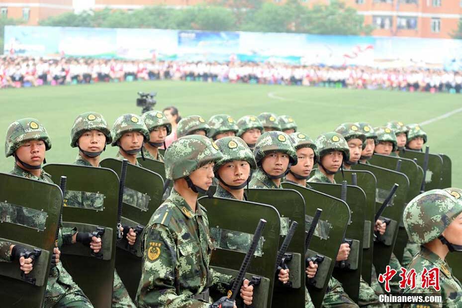 China's first college anti-terrorism and riot squad conducts a drill on the campus of Chengdu East Star Airlines Travel College on June 20, 2014. [Photo/chinanews.com]