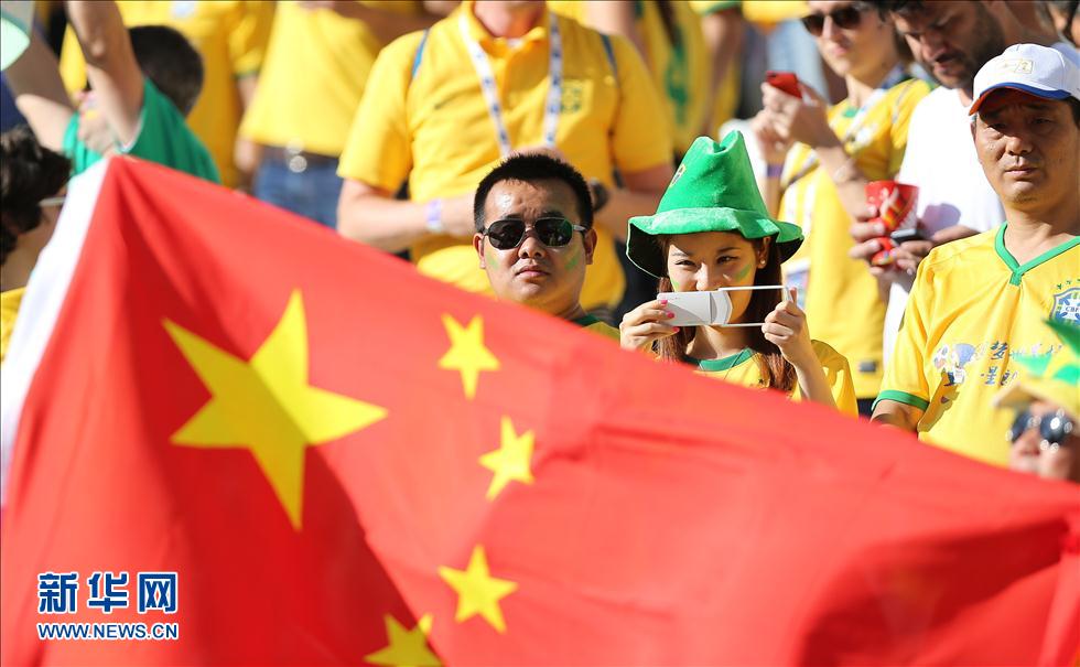 Chinese football fans show Chinese national flag at the ITAR Gellar stadium in Sao Paulo, Brazil, June 12, 2014. (Xinhua/Xu Zijian)
