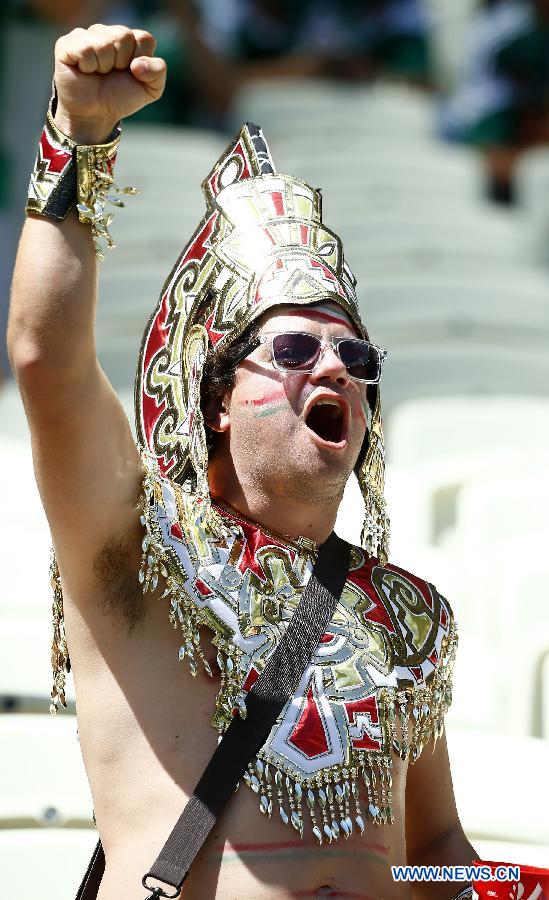 A Mexico's fan cheers prior to a Round of 16 match between Netherlands and Mexico of 2014 FIFA World Cup at the Estadio Castelao Stadium in Fortaleza, Brazil, on June 29, 2014.(Xinhua/Chen Jianli)