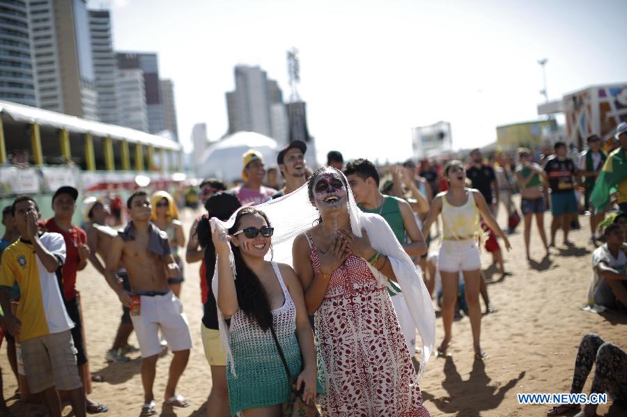 Mexico's fan cheer while watching a Round of 16 match between Netherlands and Mexico of 2014 FIFA World Cup at a FIFA fan fest in Fortaleza, Brazil, on June 29,2014.(Xinhua/Mauricio Valenzuela)