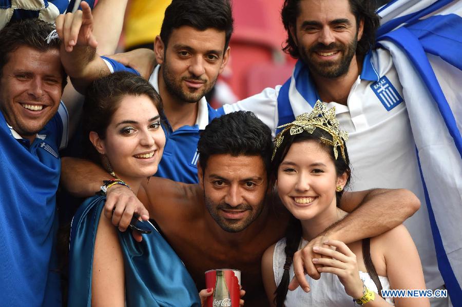 Greece's fans pose before a Round of 16 match between Costa Rica and Greece of 2014 FIFA World Cup at the Arena Pernambuco Stadium in Recife, Brazil, on June 29, 2014.(Xinhua/Guo Yong)