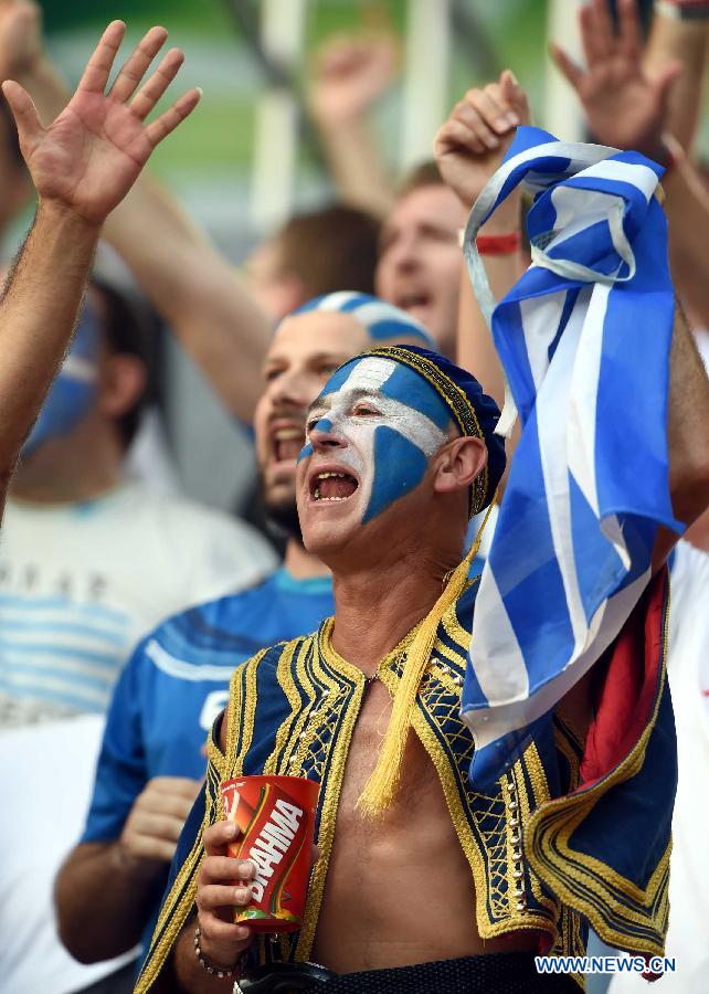 Greece's fans pose before a Round of 16 match between Costa Rica and Greece of 2014 FIFA World Cup at the Arena Pernambuco Stadium in Recife, Brazil, on June 29, 2014.(Xinhua/Guo Yong)