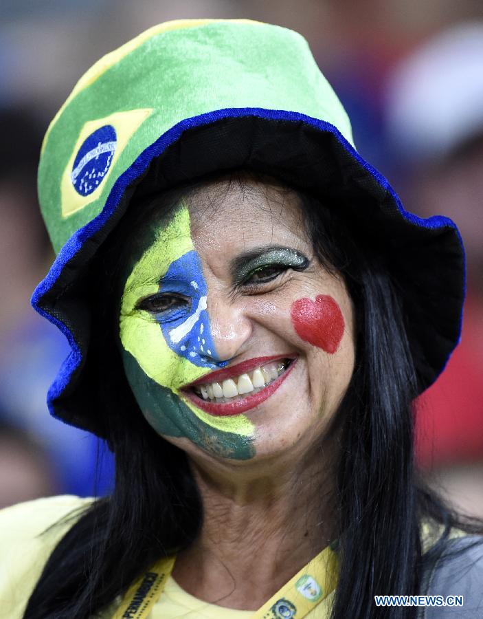 A football fan poses before a Round of 16 match between Costa Rica and Greece of 2014 FIFA World Cup at the Arena Pernambuco Stadium in Recife, Brazil, on June 29, 2014.(Xinhua/Lui Siu Wai)