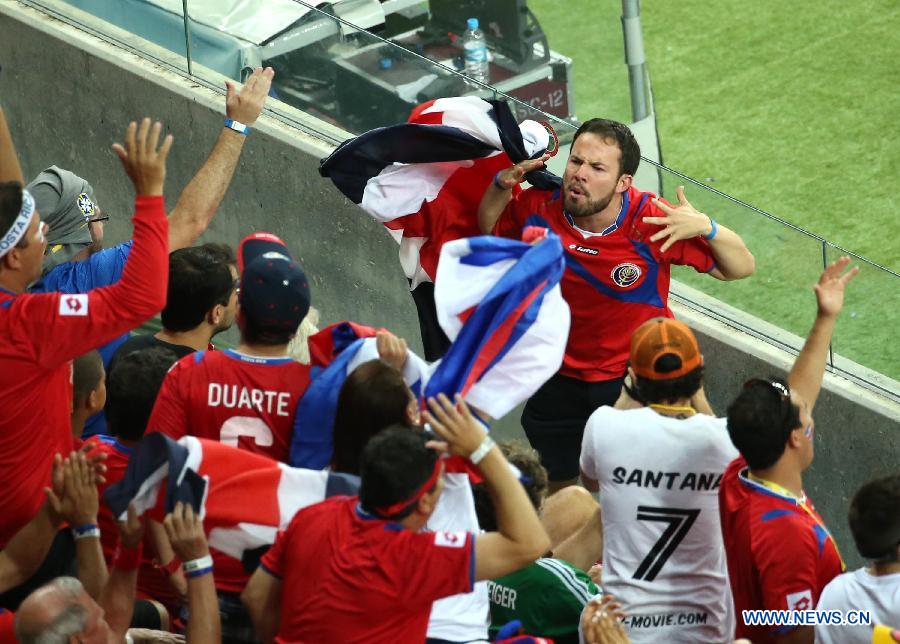 Costa Rica's fans cheer for the team during a Round of 16 match between Costa Rica and Greece of 2014 FIFA World Cup at the Arena Pernambuco Stadium in Recife, Brazil, on June 29, 2014.(Xinhua/Guo Yong)