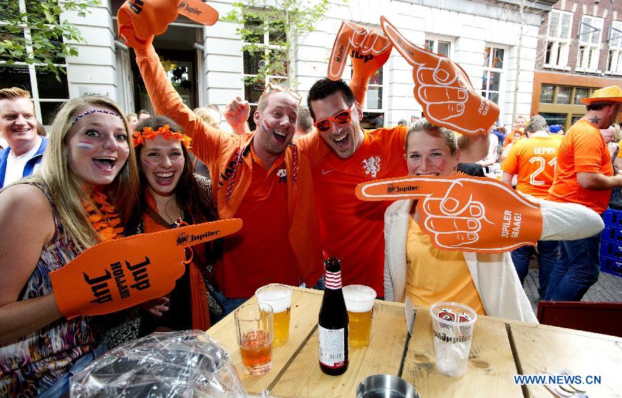 Football fans celebrate after the Netherlands defeated Mexico in the Brazil World Cup finals, in downtown Rotterdam, the Netherlands, on June 29, 2014. The Netherlands beat Mexico 2-1 on Sunday to enter the quarterfinals. (Xinhua/Robin Utrecht)