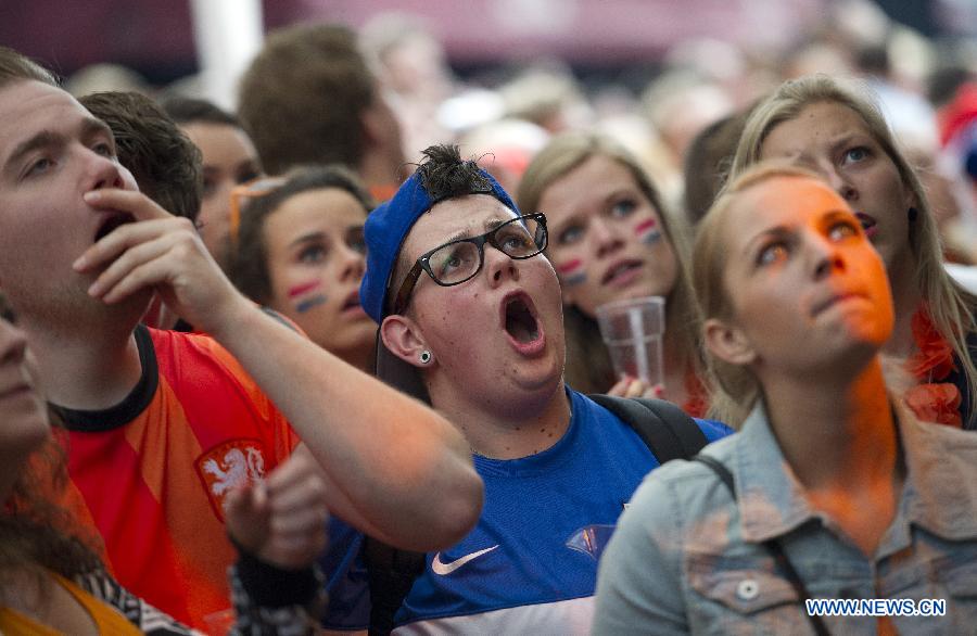 Football fans watch the televised match of the Netherlands with Mexico in the Brazil World Cup finals, in downtown Rotterdam, the Netherlands, on June 29, 2014. The Netherlands beat Mexico 2-1 on Sunday to enter the quarterfinals. (Xinhua/Robin Utrecht)