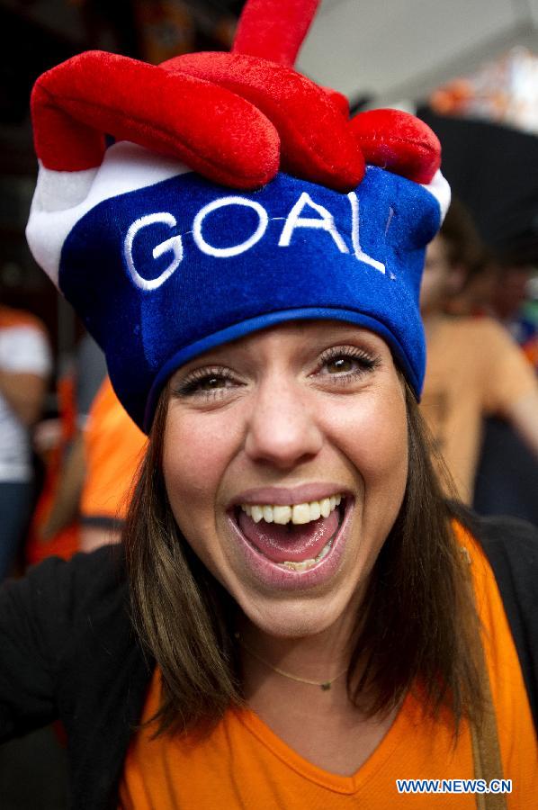 A football fan celebrates after the Netherlands defeated Mexico in the Brazil World Cup finals, in downtown Rotterdam, the Netherlands, on June 29, 2014. The Netherlands beat Mexico 2-1 on Sunday to enter the quarterfinals. (Xinhua/Robin Utrecht)
