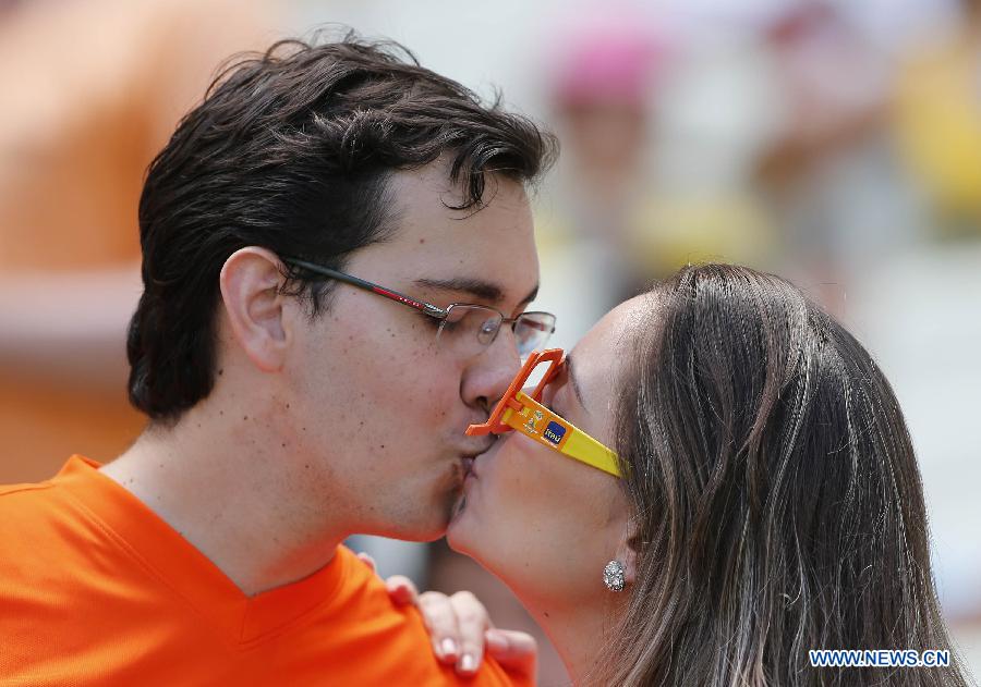Netherlands's fans kiss before a Round of 16 match between Mexico and Netherlands of 2014 FIFA World Cup at the Estadio Castelao Stadium in Fortaleza, Brazil, on June 29, 2014. (Xinhua/Zhou Lei)