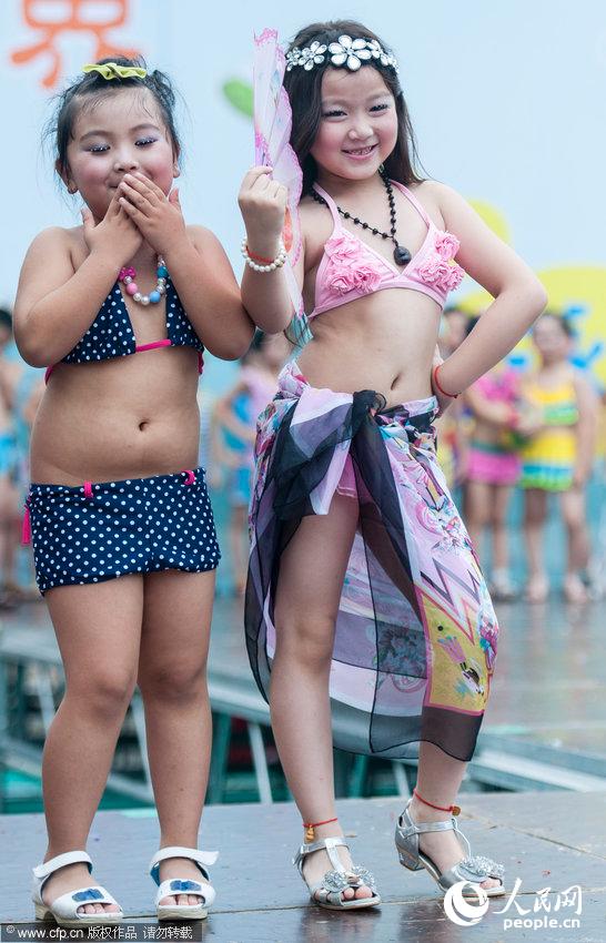 Children put up a swimming suits show to celebrate graduation from Changtian Kindergarten in Wenling of east China's Zhejiang province, July 4, 2014. (Photo/CFP)
