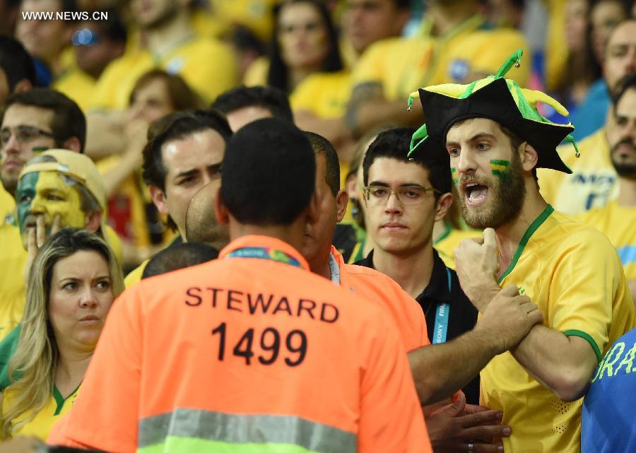 A Brazil's supporter argues with security members during a semifinal match between Brazil and Germany of 2014 FIFA World Cup at the Estadio Mineirao Stadium in Belo Horizonte, Brazil, on July 8, 2014.(Xinhua/Liu Dawei)