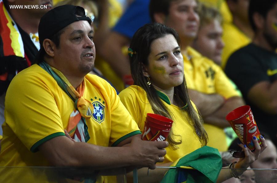 Brazil's fans react while watching a semifinal match between Brazil and Germany of 2014 FIFA World Cup at the Estadio Mineirao Stadium in Belo Horizonte, Brazil, on July 8, 2014.(Xinhua/Li Ga)