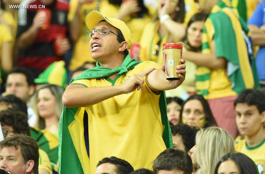 A Brazil's supporter reacts during a semifinal match between Brazil and Germany of 2014 FIFA World Cup at the Estadio Mineirao Stadium in Belo Horizonte, Brazil, on July 8, 2014.(Xinhua/Liu Dawei)