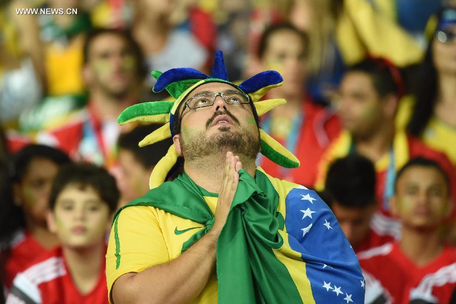 A Brazil's supporter prays during a semifinal match between Brazil and Germany of 2014 FIFA World Cup at the Estadio Mineirao Stadium in Belo Horizonte, Brazil, on July 8, 2014.(Xinhua/Liu Dawei)