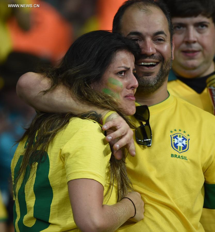 Brazil's fans react while watching a semifinal match between Brazil and Germany of 2014 FIFA World Cup at the Estadio Mineirao Stadium in Belo Horizonte, Brazil, on July 8, 2014.(Xinhua/Li Ga)