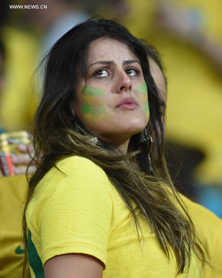 A Brazil's fan reacts while watching a semifinal match between Brazil and Germany of 2014 FIFA World Cup at the Estadio Mineirao Stadium in Belo Horizonte, Brazil, on July 8, 2014.(Xinhua/Li Ga)