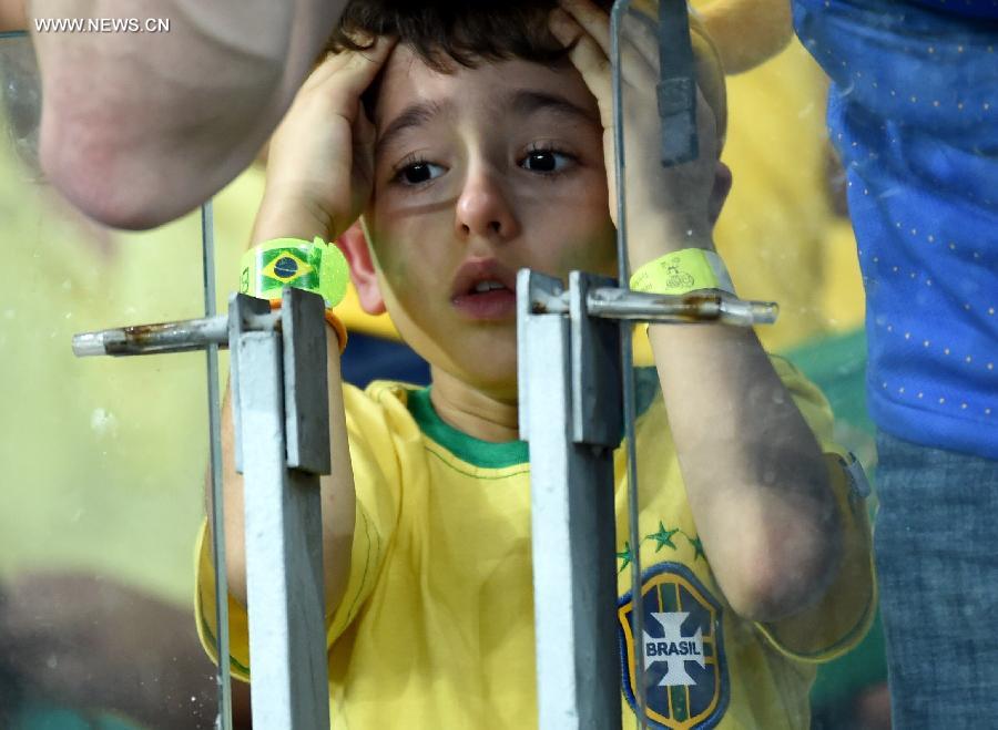 | A Brazil's fan reacts while watching a semifinal match between Brazil and Germany of 2014 FIFA World Cup at the Estadio Mineirao Stadium in Belo Horizonte, Brazil, on July 8, 2014.(Xinhua/Li Ga) |