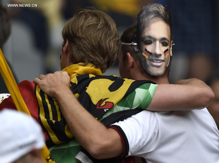 Supporters of Germany pose before a semifinal match between Brazil and Germany of 2014 FIFA World Cup at the Estadio Mineirao Stadium in Belo Horizonte, Brazil, on July 8, 2014.(Xinhua/Qi Heng)