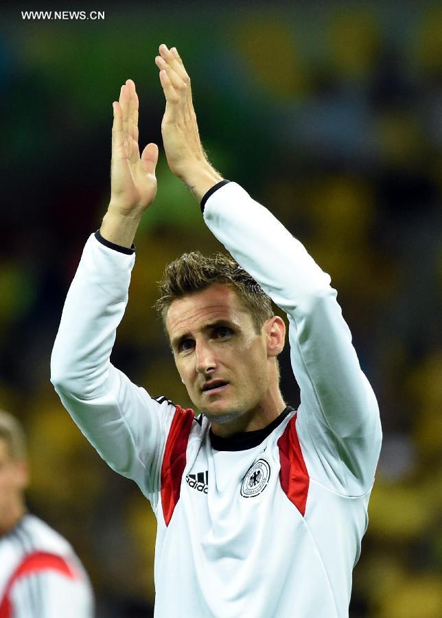 | Germany's Miroslav Klose applauds spectators after a semifinal match between Brazil and Germany of 2014 FIFA World Cup at the Estadio Mineirao Stadium in Belo Horizonte, Brazil, on July 8, 2014. Germany won 7-1 over Brazil and qualified for the final on Tuesday. (Xinhua/Liu Dawei) |