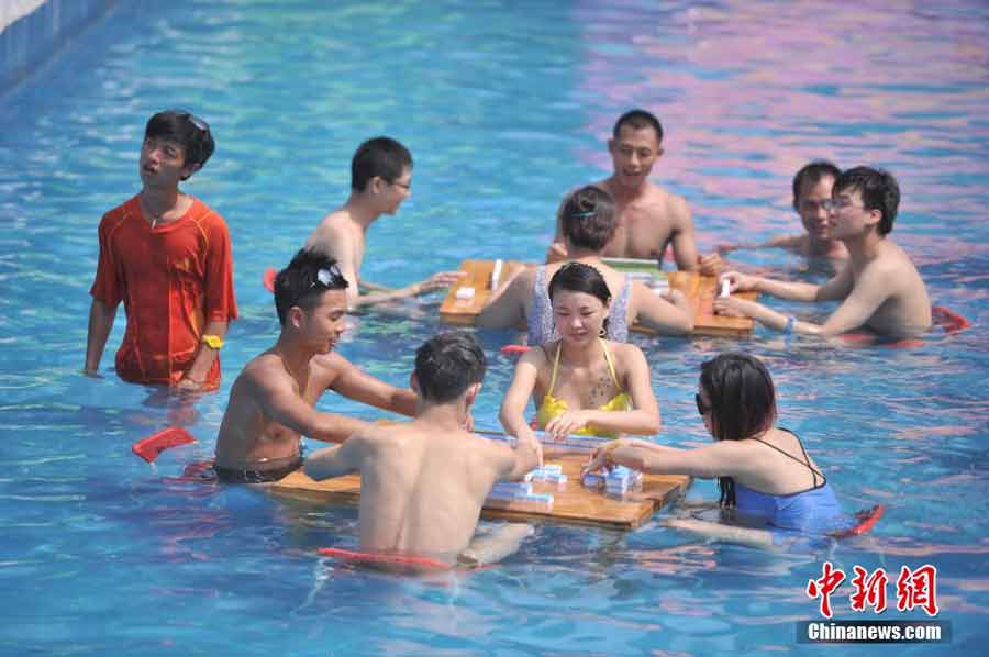 Hot weather drives citizens to play mahjong in water (6)