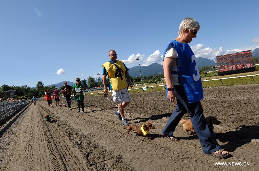 Dachshunds and their owners walk towards the start line of the annual Wiener Dog Racing at Hastings Race Course in Vancouver, Canada, July 13, 2014. More than 70 dachshunds were running to the finish line. (Xinhua/Sergei Bachlakov)