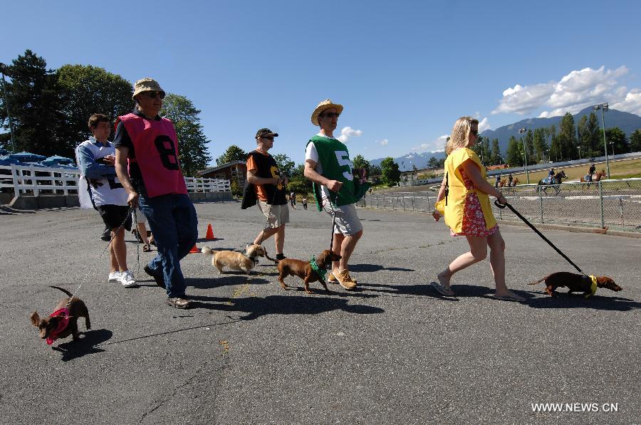 Dachshunds and their owners walk towards the start line of the annual Wiener Dog Racing at Hastings Race Course in Vancouver, Canada, July 13, 2014. More than 70 dachshunds were running to the finish line. (Xinhua/Sergei Bachlakov)