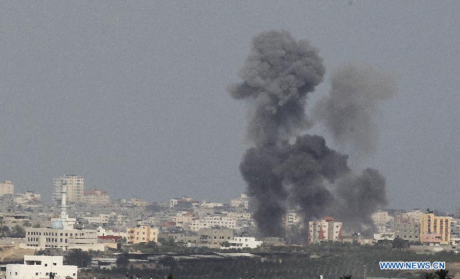 Smoke rises after an Israeli air strike in the northern Gaza Strip, on July 13, 2014. Israeli navy commando raid comes as Israeli forces intensified its attacks on Gaza on Saturday, leaving 56 people dead, the heaviest death toll since the beginning of the operation, according to a statement by the Palestinian Ministry of Health. The death toll of the Palestinians now stands at 165, while at least 780 others were wounded, according to the health ministry and Gaza-based Al Meazan Center for Human Rights. The U.N. estimates that some 77 percent of the casualties were civilians. (Xinhua/Muammar Awad)
