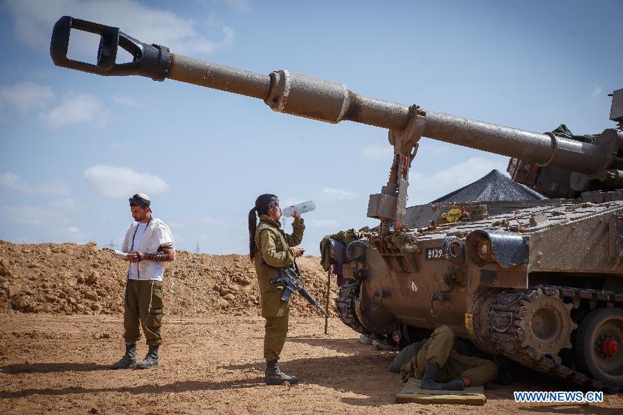 An Israeli soldier prays near a 155mm M109 Dores self-propelled howitzer positioned along the southern Israeli border with the Gaza Strip, on July 13, 2014. Israeli navy commando raid comes as Israeli forces intensified its attacks on Gaza on Saturday, leaving 56 people dead, the heaviest death toll since the beginning of the operation, according to a statement by the Palestinian Ministry of Health. The death toll of the Palestinians now stands at 165, while at least 780 others were wounded, according to the health ministry and Gaza-based Al Meazan Center for Human Rights. The U.N. estimates that some 77 percent of the casualties were civilians. (Xinhua/JINI)