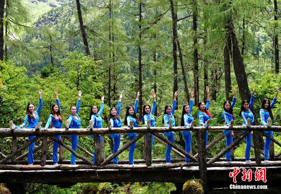 | Chinese women's fitness team takes training in Bipenggou scenic zone in Lixian County of the Tibetan-Qiang Autonomous Prefecture of Aba, southwest China's Sichuan Province on July 14, 2014. They conducted a 10-day outdoor training. Bipenggou is located at the northern foot of Four Girls Mountain, 221 kilometers northwest of Chengdu. (CNS/An Yuan) |