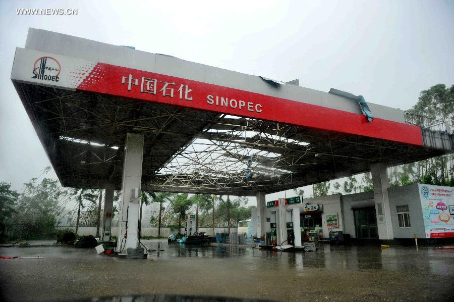 Photo taken on July 19, 2014 shows a gas station damaged due to the super typhoon Rammasun in Qinzhou City of Guangxi Zhuang Autonomous Region. Typhoon Rammasun, the ninth in this year and the strongest in decades, made its latest landfall in southwest China's Guangxi at 7:10 a.m. on Saturday and packed gales of up to 48 meters per second, the National Meteorological Center (NMC) said in a statement. (Xinhua/Zhang Ailin)