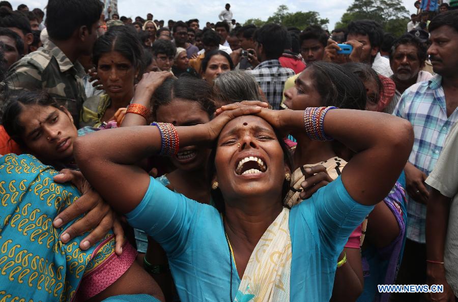 People grieve atthe site of traffic accident at Masayapeta near Hyderabad, capitalof south Indian state of Telangana, July 24, 2014. At least 20students and their school bus driver were killed while 20 otherstudents injured after a speeding train rammed into the bus at anunmanned crossing on Thursday, a police official said.(Xinhua/AP)