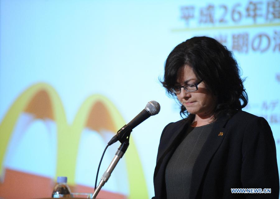 Sarah Casanova, President and Chief Executive Officer of McDonald's Holdings Japan, touches her glasses during a press conference in Tokyo, Japan, July 29, 2014. McDonald's Holdings Japan announced its financial report and expressed its apologies concerning the recent food scandal.(Xinhua/Stringer)