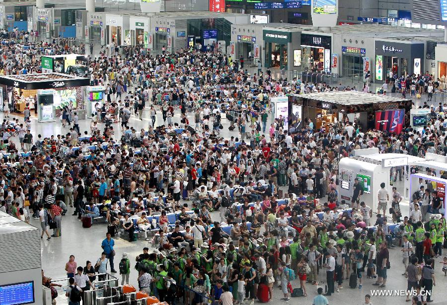 A large number of passengers wait for their trains at Hongqiao railway station in east China's Shanghai Municipality, July 29, 2014. According to the Air Traffic Management Bureau of the Civil Aviation Administration of China, Shanghai's two main airports -- Hongqiao and Pudong -- would witness an air traffic capacity drop by 75 percent at some stages on Tuesday. Eastern China have been experiencing lots of flight delays recently. (Xinhua/Pei Xin)