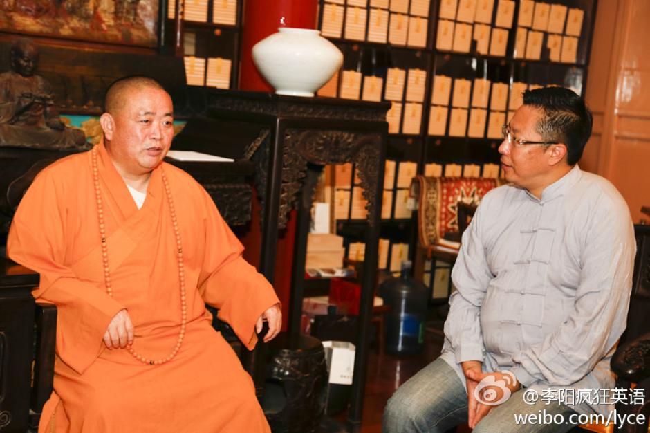 Li Yang (right) converts to Buddhism recently in the Shaoling Temple in Dengfeng of Central China's Henan province on July 26, 2014. (Photo/Weibo)