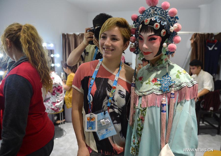 An athlete (C) poses for a photo with an actress during a visit to Jinling Theater at Laomendong, Nanjing, capital city of east China's Jiangsu Province, August 24, 2014. Young athletes are invited by the 2014 Nanjing Youth Olympic Games organizing committee to an traditional opera tour to Jinling Theater where they enjoy performance of traditional Chinese opera, including Beijing opera, Kun opera and so on. (Xinhua/Shen Peng)
