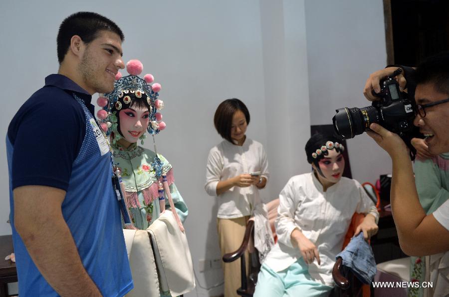 An athlete (L) poses for a photo with an actress during a visit to Jinling Theater at Laomendong, Nanjing, capital city of east China's Jiangsu Province, August 24, 2014. Young athletes are invited by the 2014 Nanjing Youth Olympic Games organizing committee to an traditional opera tour to Jinling Theater where they enjoy performance of traditional Chinese opera, including Beijing opera, Kun opera and so on. (Xinhua/Shen Peng)