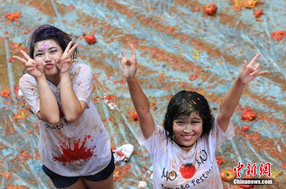 Chinese and foreigners take part in an tomato and food fight party in Shenyang, northeast China's Liaoning Province on August 30, 2014. A few hundred tomato-slinging party-goers took part in what organizers called a mini La Tomatina, a tomato-flinging festival that is sometimes called the world's biggest food battle. Many of China's big cities host the "La Tomatina" food fights, which have drawn criticism from the public as a regrettable waste of food. (China News Service/Zhang Peng)