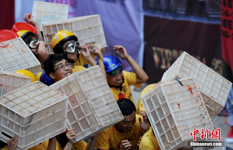 Chinese and foreigners take part in an tomato and food fight party in Shenyang, northeast China's Liaoning Province on August 30, 2014. A few hundred tomato-slinging party-goers took part in what organizers called a mini La Tomatina, a tomato-flinging festival that is sometimes called the world's biggest food battle. Many of China's big cities host the "La Tomatina" food fights, which have drawn criticism from the public as a regrettable waste of food. (China News Service/Zhang Peng)