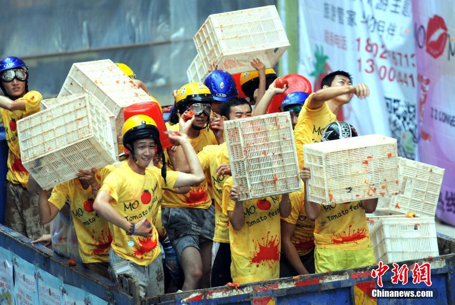 Chinese and foreigners take part in an tomato and food fight party in Shenyang, northeast China's Liaoning Province on August 30, 2014. A few hundred tomato-slinging party-goers took part in what organizers called a mini La Tomatina, a tomato-flinging festival that is sometimes called the world's biggest food battle. Many of China's big cities host the "La Tomatina" food fights, which have drawn criticism from the public as a regrettable waste of food. (China News Service/Zhang Peng)