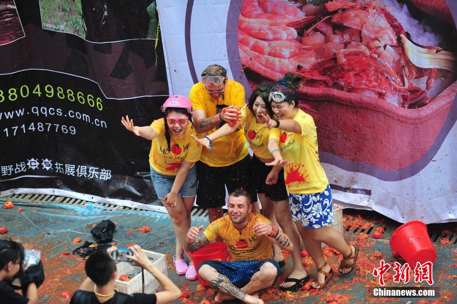 Chinese and foreigners take part in an tomato and food fight party in Shenyang, northeast China's Liaoning Province on August 30, 2014. A few hundred tomato-slinging party-goers took part in what organizers called a mini La Tomatina, a tomato-flinging festival that is sometimes called the world's biggest food battle. Many of China's big cities host the "La Tomatina" food fights, which have drawn criticism from the public as a regrettable waste of food. (China News Service/Zhang Peng)