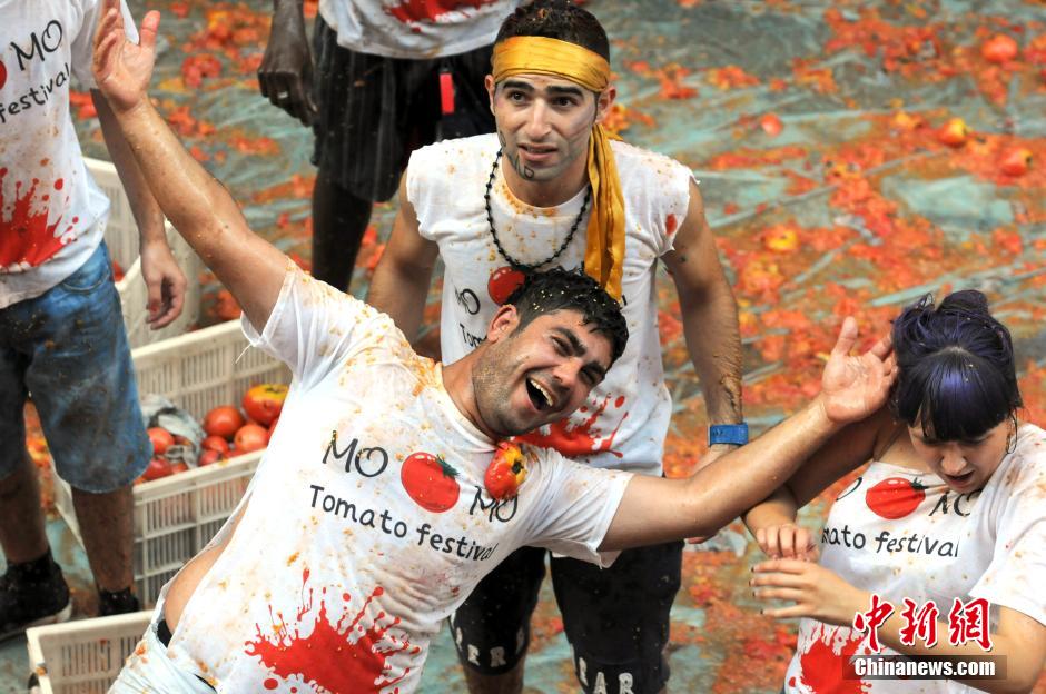 Chinese and foreigners take part in an tomato and food fight party in Shenyang, northeast China's Liaoning Province on August 30, 2014. A few hundred tomato-slinging party-goers took part in what organizers called a mini La Tomatina, a tomato-flinging festival that is sometimes called the world's biggest food battle. Many of China's big cities host the "La Tomatina" food fights, which have drawn criticism from the public as a regrettable waste of food. (China News Service/Zhang Peng)