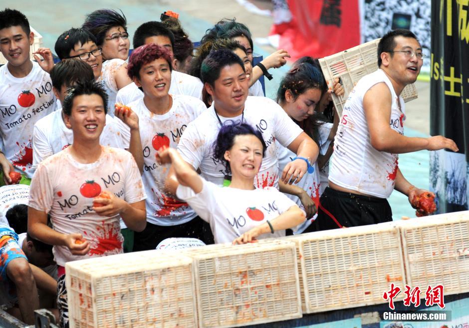 Chinese and foreigners take part in an tomato and food fight party in Shenyang, northeast China's Liaoning Province on August 30, 2014. A few hundred tomato-slinging party-goers took part in what organizers called a mini La Tomatina, a tomato-flinging festival that is sometimes called the world's biggest food battle. Many of China's big cities host the "La Tomatina" food fights, which have drawn criticism from the public as a regrettable waste of food. (China News Service/Zhang Peng)