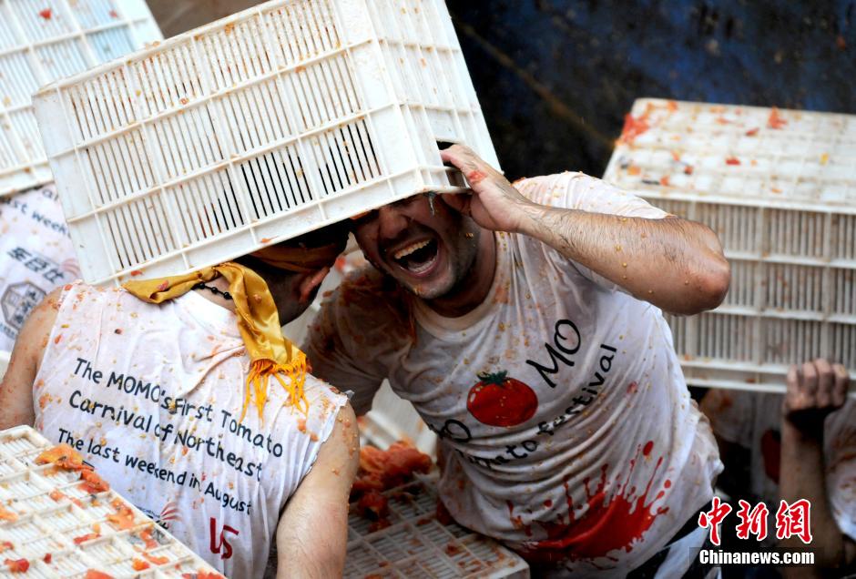 Chinese and foreigners take part in an tomato and food fight party in Shenyang, northeast China's Liaoning Province on August 30, 2014. A few hundred tomato-slinging party-goers took part in what organizers called a mini La Tomatina, a tomato-flinging festival that is sometimes called the world's biggest food battle. Many of China's big cities host the "La Tomatina" food fights, which have drawn criticism from the public as a regrettable waste of food. (China News Service/Zhang Peng)