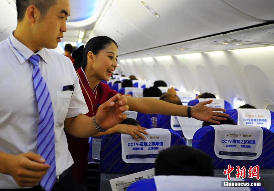 The younger sister Adilai and her colleague conduct safety checks and remind passengers to fasten their seat belts prior to takeoff. (Photo/Chinanews.com)
