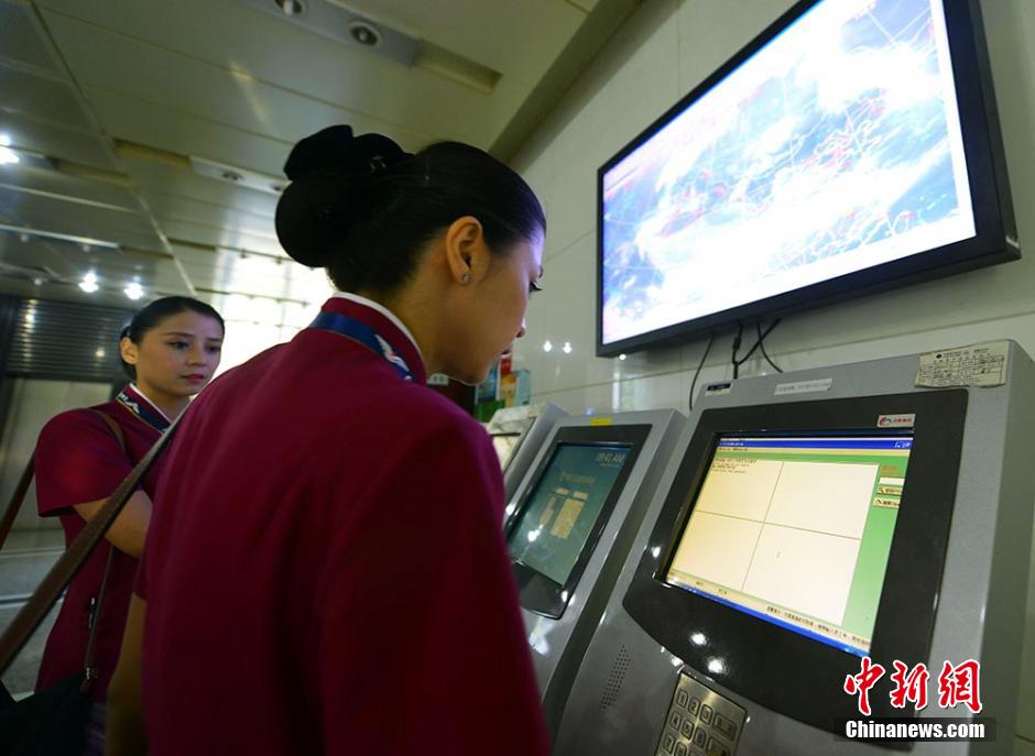 The twin sisters sign in in the operations command center. Although both are attendants of the Southern Airlines’ Xinjiang Company, they rarely have opportunities to serve on the same flight. (Photo/Chinanews.com)